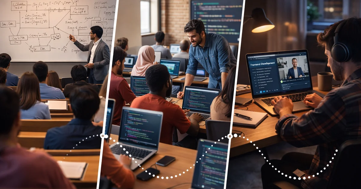 Vier Wege führen in die Frontend-Entwicklung, und keiner davon ist perfekt. Eine IHK-Ausbildung bietet Sicherheit und Praxisnähe, aber wenig Frontend-Spezialisierung. Ein Studium liefert theoretische Tiefe, kostet aber drei bis vier Jahre und lehrt Frontend nur nebenbei. Bootcamps sind schnell und intensiv, verlangen aber hohe Eigenmotivation danach, während der autodidaktische Weg zwar kostenfrei ist, aber einsam und ohne formale Absicherung bleibt.